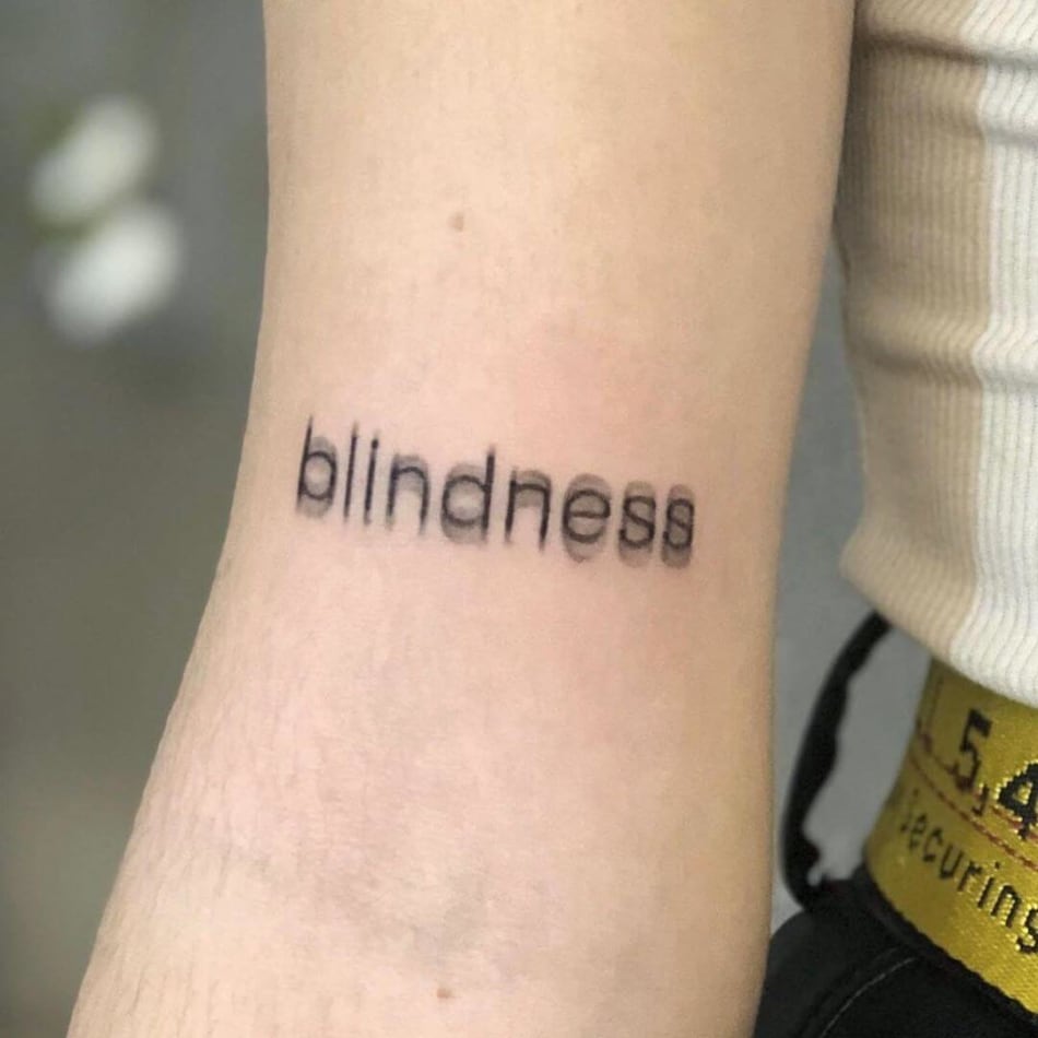 Blurry word "Focus" tattooed on the inner arm.
